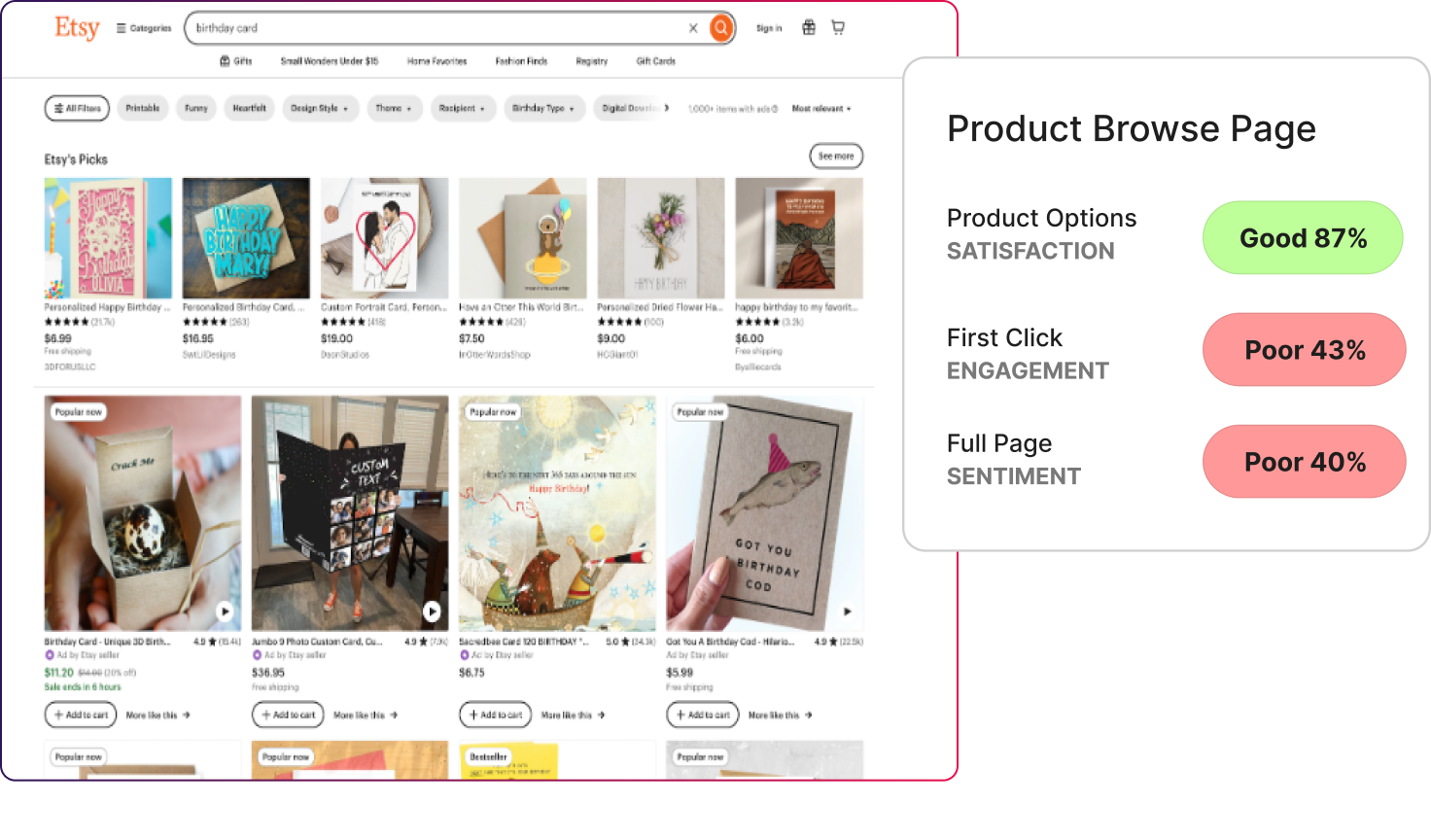 - On Etsy’s product browse page, users rated product options highly (87% satisfaction). But first-click engagement dropped to 43%, and full-page sentiment fell to 40%.