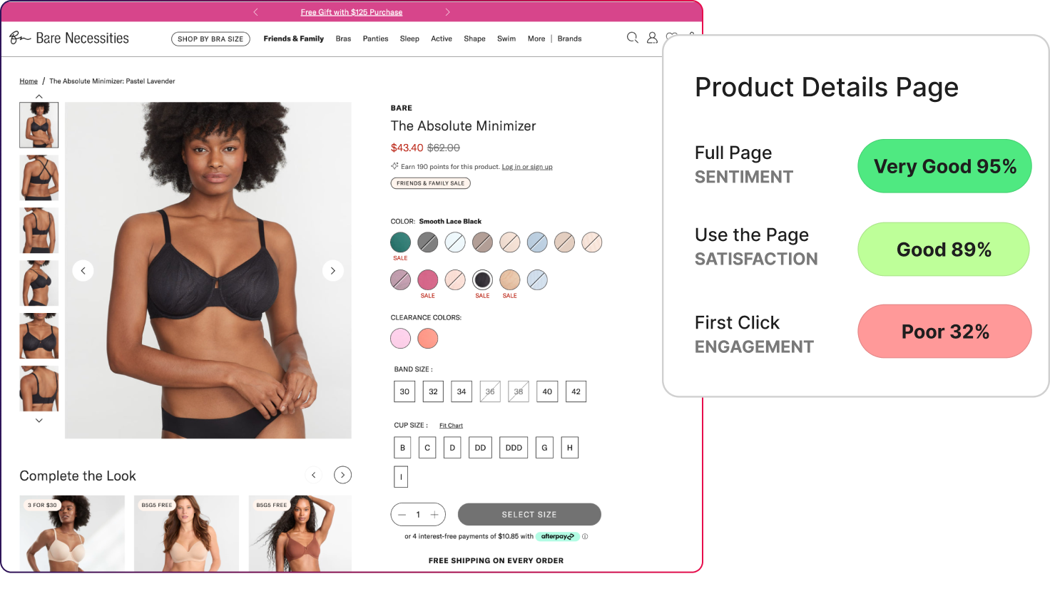 - On the Bare Necessities product details page, full-page sentiment reached 95% and satisfaction hit 89%, yet first-click engagement fell to 32%.