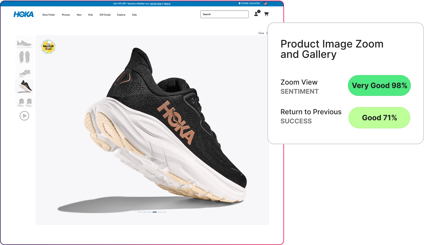 - On HOKA’s product image zoom and gallery, zoom interactions scored extremely high on sentiment (98%), yet success returning to the previous state fell to 71%.