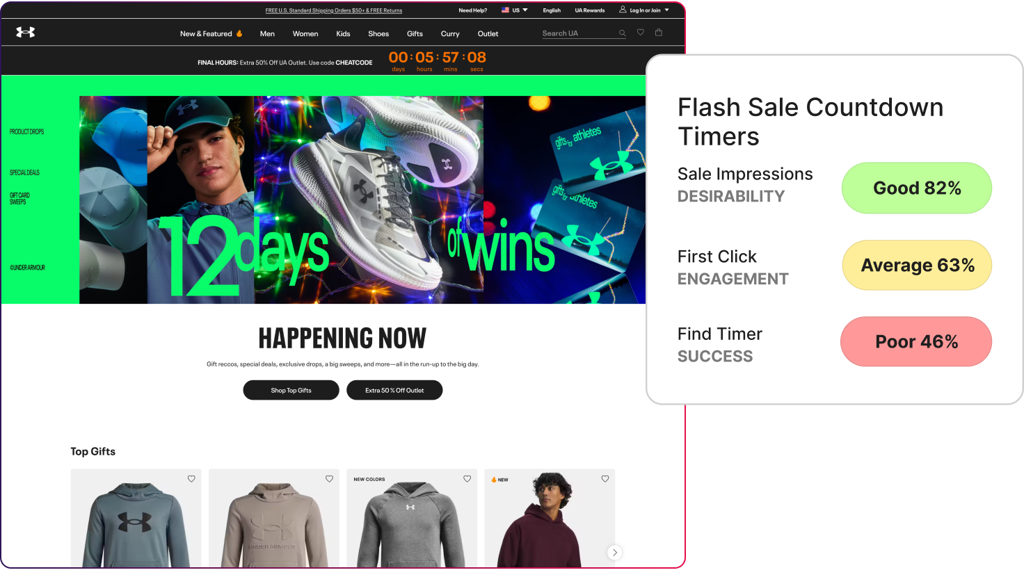 - On Under Armour’s flash sale, sale impressions scored 82% for desirability, while success locating the timer fell to 46%.