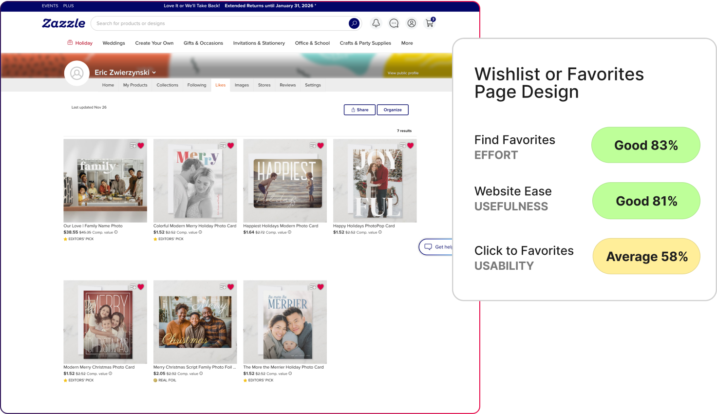 On Zazzle’s favorites page, usefulness scored 81%, and effort to find saved items reached 83%. But usability for clicking to favorites dropped to 58%.